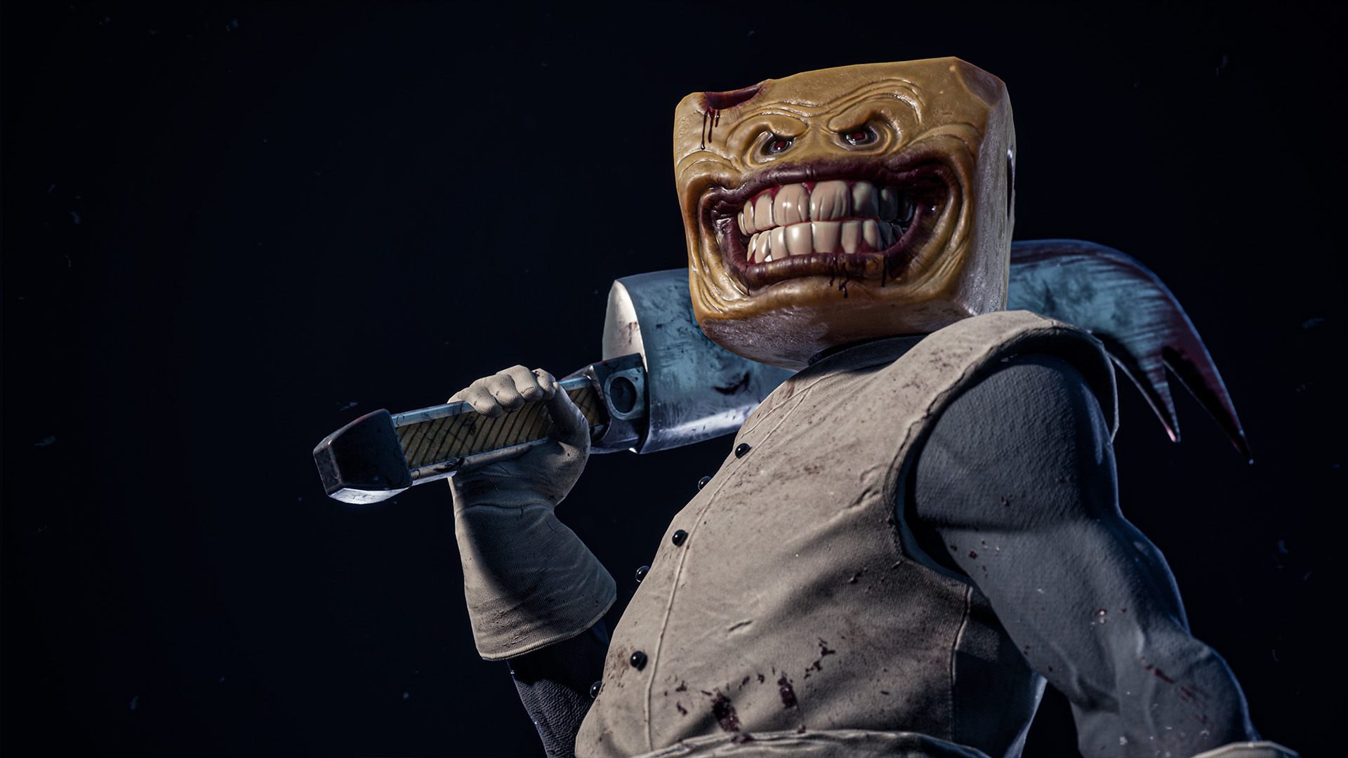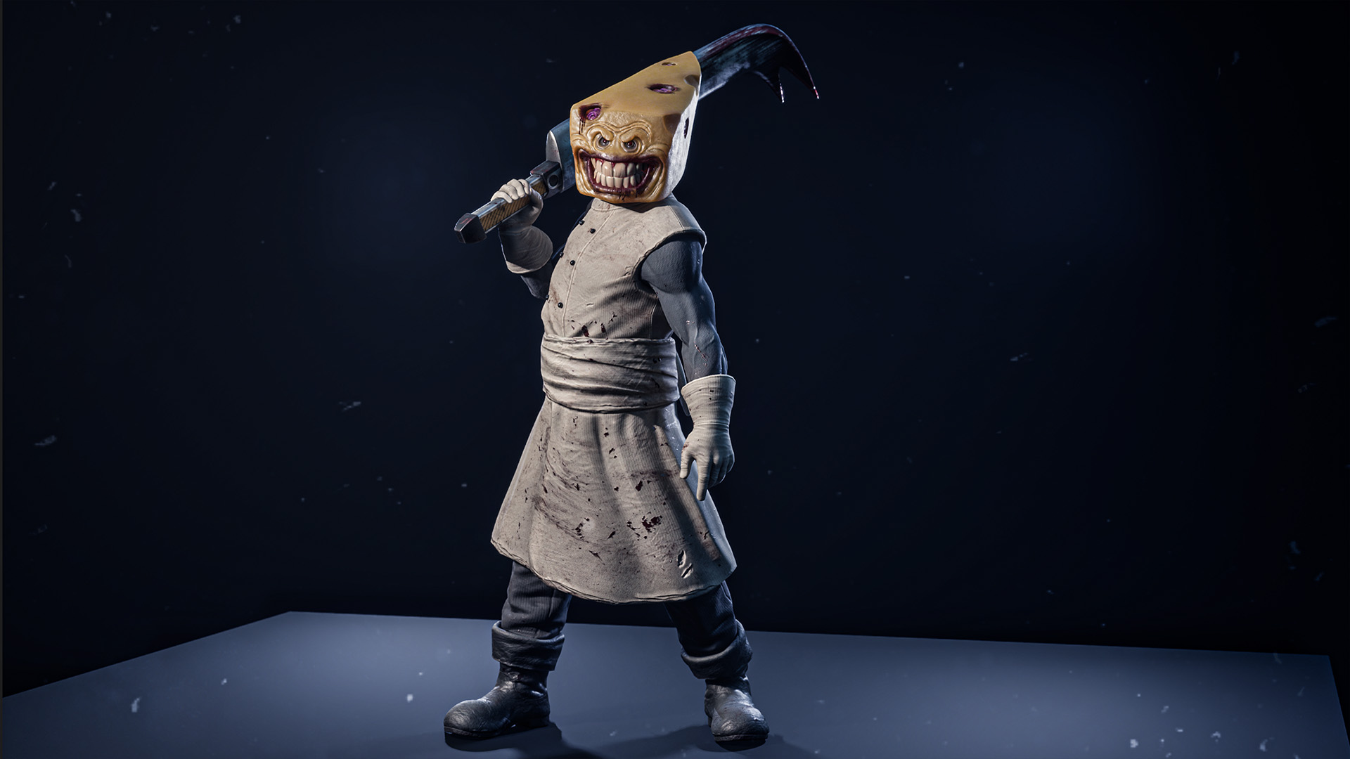 This 3d model on commision depicts a tall, thin man with fuzzy hair starting at the top of his head and reaching down to his neck. The villain wears a paper mache mask with a macabre smile and small, cold round eyes.